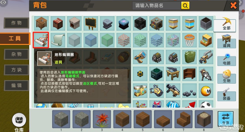 地形编辑器需要在创建开发者地图,版本必在背包-工具页面下找到: