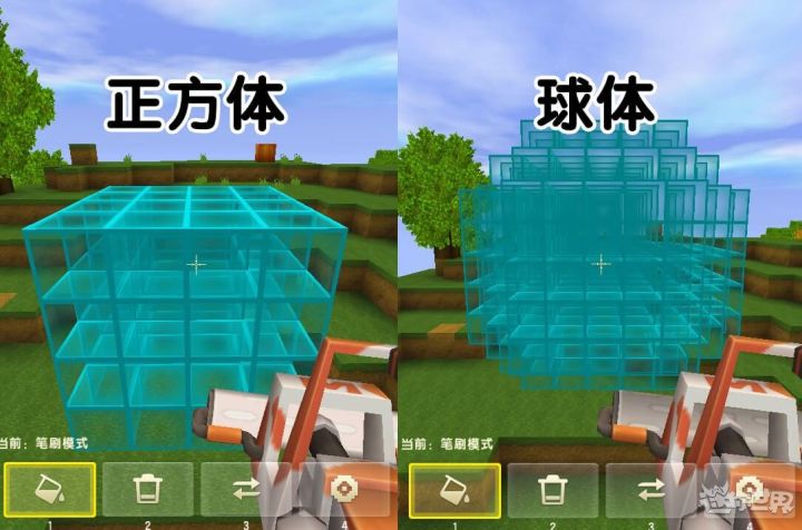 ②小伙伴们可以校验到画面最左侧有一个“笔刷”栏,里面有七种笔刷:正方体 、创建圆柱体、全新球体、平面四边形、平面圆形 、两点连线 、两点连面 。点击不同的笔刷可以改变准星出蓝色笔刷的形状,我们用正方体和球体举例 :